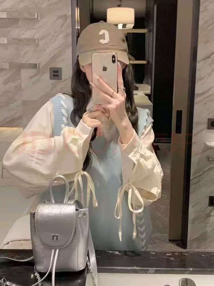湮雨霓裳【两件套装]ins韩系校园风蝴蝶绑带针织马甲背心毛衣女学生+衬衫