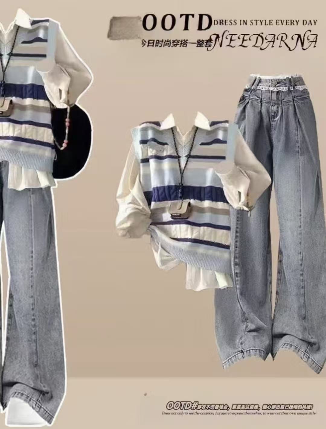 MZPLOI初中生初秋毛衣马甲衬衫设计感2025学院风显瘦牛仔裤学生三件套装